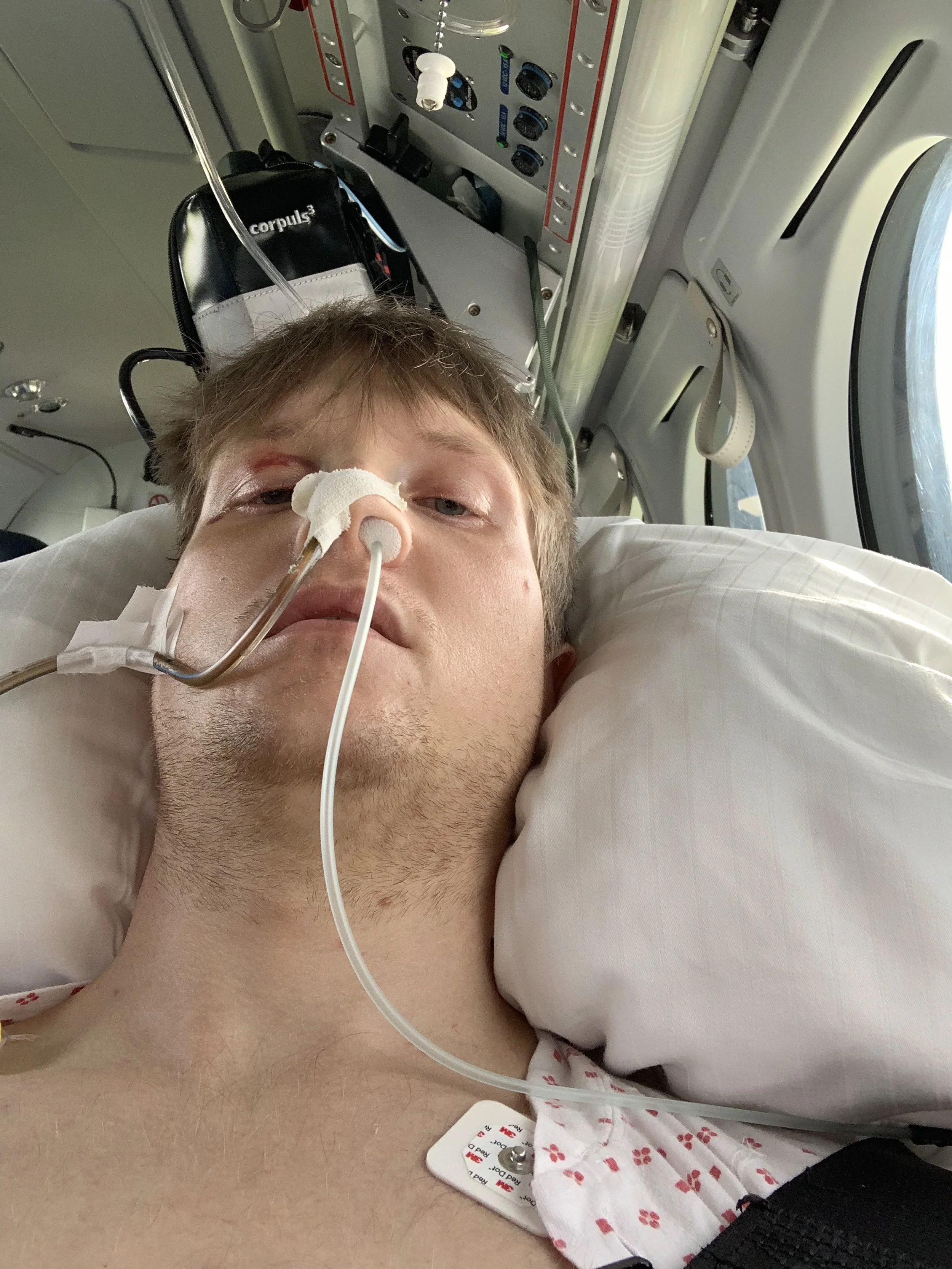 That was all that kept me going. After a few more days I started to feel a bit better. Still in a lot of pain, but I managed to stand up and walk 2 or 3 times a day. And the doctor came in every day and said things seemed to improve. I started to feel like “Maybe I´ll be back on the bike soon”, and I started to feel a bit positive. They said since I belonged to Trondheim, they would send me down to heal at my local hospital. After another day or two I was transported by ambulance airplane back to Trondheim. That was a strange journey. Flying in a tiny plane stretched out on a gurney with bags sticking out of my body and having to have air pumped out of my stomach to counter the nausea. Also here we were incredibly lucky that Pia was able to fly with me. That made the trip a lot easier.